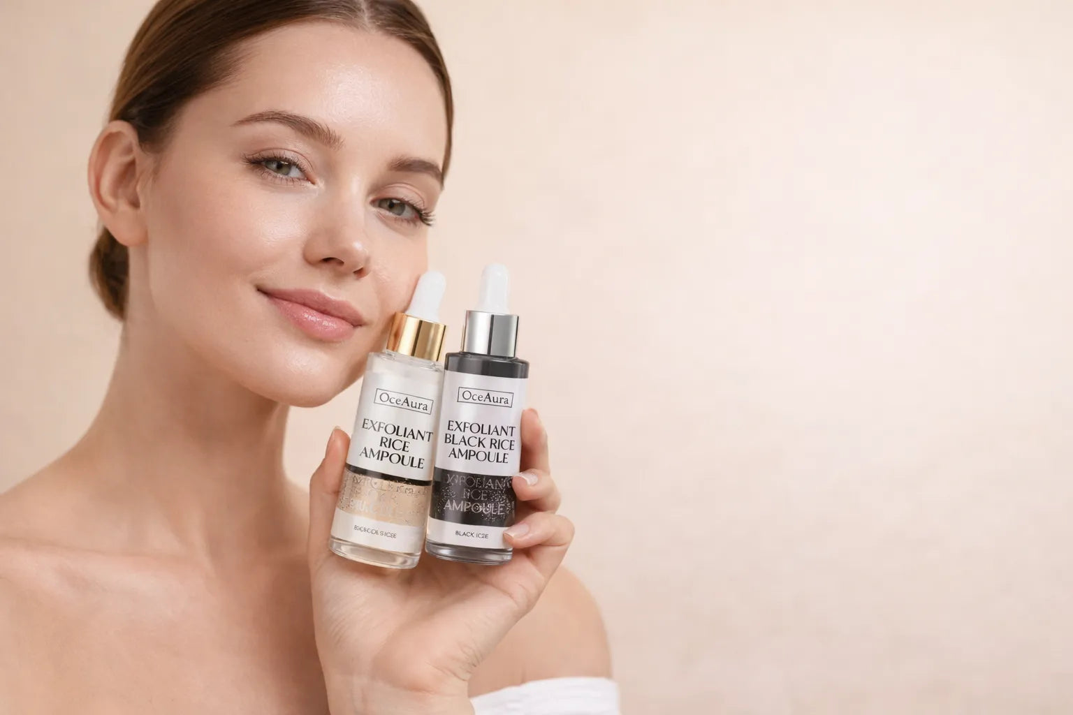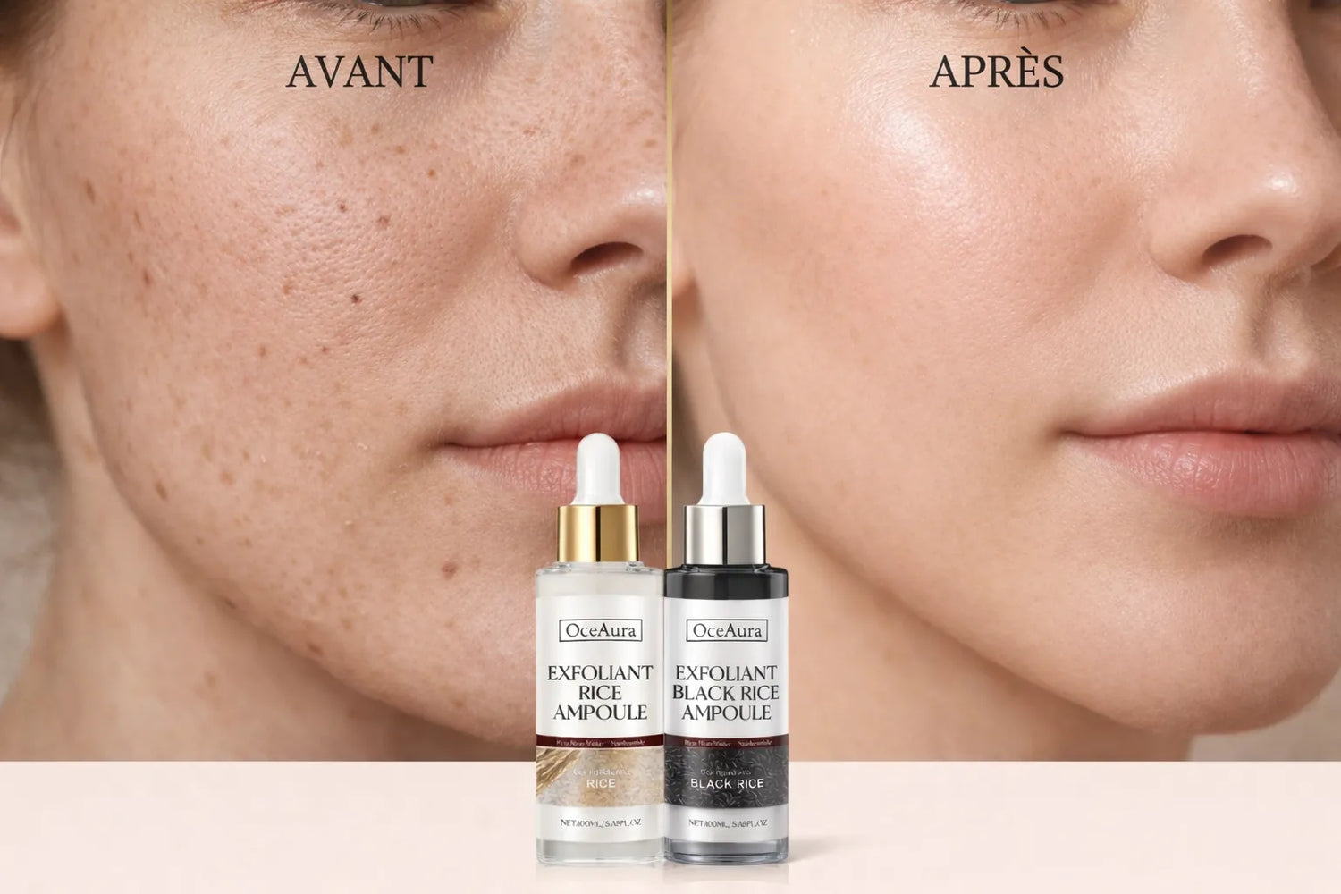 1.Sérum Éclat de Riz Hydrate et prépare la peau 2.Ampoule Exfoliante au RizAffinement du grain de peau et éclat